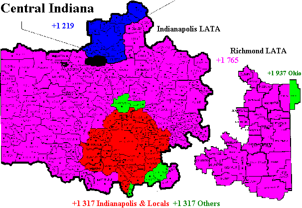 ![]() Ameritech's February Bill Insert The Split in Pictures On these maps of the Indianapolis and Richmond LATAs in Indiana, the blue areas show the current 219 NPA (Northern Indiana), the red areas show the 317 NPA exchanges that are local to Indianapolis, and the green area shows the other exchanges that will stay with 317. The purple area is now 765. [Note that the Shelbyville area is shaded to denote the change from the original plan.] ![]() (The green area in the Richmond LATA is Union City, Ohio, which moved from the 513 NPA to the new 937 NPA beginning September 28, 1996. The new NPA 937 is required after June 14, 1997.) The Split in Words Area Code (NPA) 317 has grown to the point where a split was needed. As of Jan 10, 1996, NPA 317 had 568 exchange numbers, or was 71% full. As of Apr 15, 1996, NPA 317 had 589 exchange numbers, or was 75% full. It is expected that further exchanges will be added within the next few years that will require 317 to split into two smaller areas. (78 new exchange codes have been added in Indianapolis Locals, 34 outside Indianapolis in 1994 and 1995. 12 new were added to Indianapolis and 9 outside in the first three months of 1996. As of January 1997 there were 627 exchanges in 317.) Indiana Cities to stay in 317