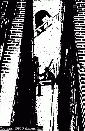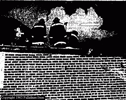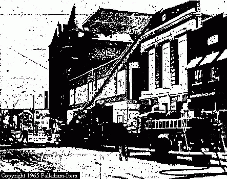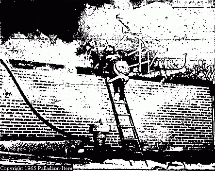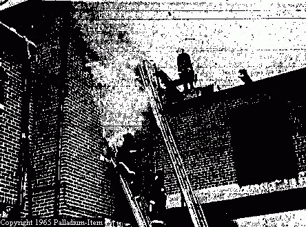 [Photo] Two firemen are on ladders between the north side of The Palladium-Item building and the telephone company building. A narrow passageway separates the two structures.